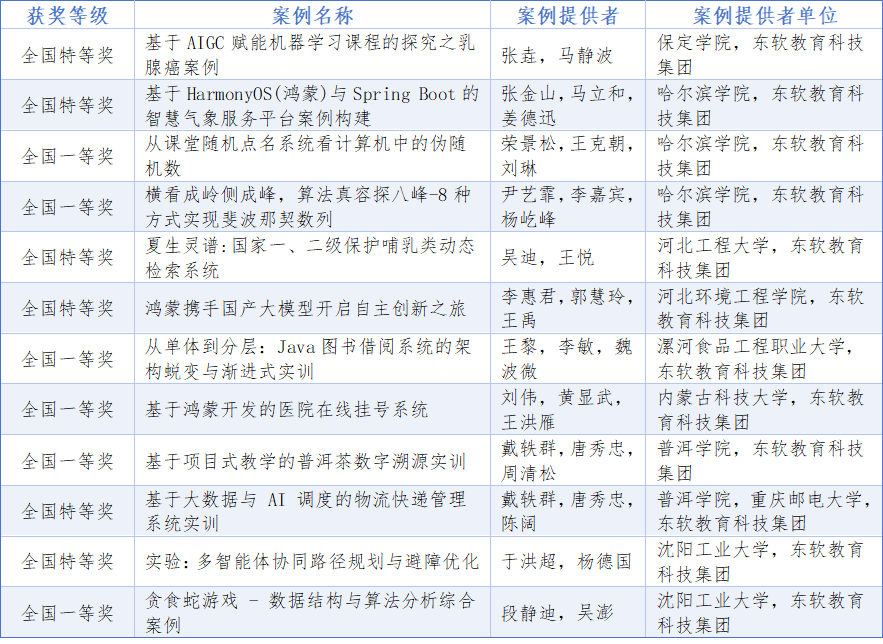 东软教育选送的12项教学案例脱颖而出,实现“全中靶”式获奖——斩获全国特等奖6项、一等奖6项,获奖质量与数量位居同类教育机构前列。获奖案例涵盖AIGC赋能机器学习、鸿蒙(HarmonyOS)生态开发、算法与数据结构创新实践、多智能体协同技术、产业场景化项目实训(含普洱茶数字溯源、物流AI调度等)多个前沿方向,均源自东软教育与合作院校联合打造的实训项目,将企业真实工单、技术规范深度融入教学全过程,累计覆盖数千名学生的实践培养。