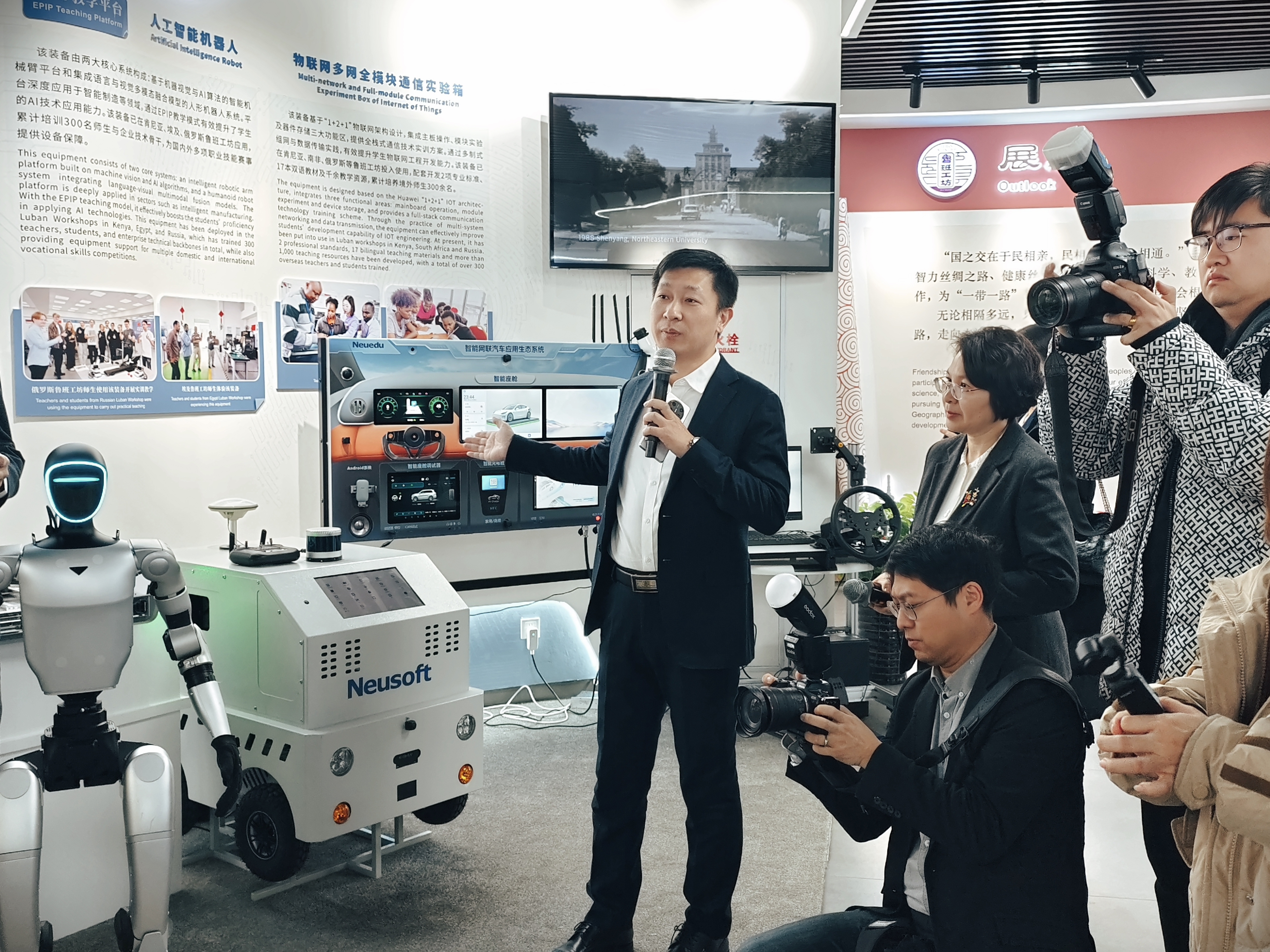 同时在参加“驻华使节天津行”活动时。东软教育科技集团董本清总裁在活动现场人工智能展区,向九国驻华使节介绍了东软自主研发的智能网联汽车沙盘等系列产品:该产品深度融合智能网联汽车产业场景,将先进信息技术与车辆业务实际相结合,以智能网联汽车系统沙盘、自动驾驶车辆、空地协同无人机及车路协同仿真测试系统为核心特色,构建覆盖“车-路-云”的一体化协同通信体系。通过软件开发与人工智能技术赋能,系统实现了“空地协同”“智能旅拍”等创新功能,并支持自媒体内容的编辑与发布,为智慧交通与数字出行提供完整解决方案。